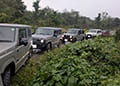 ※参加車両は20mm以上のリフトアップ、前後に頑丈な牽引フック、トランスファーガード、サイドシルガード、燃料タンクガード、185/85R16以上のタイヤの装着、SJ30〜JA22は走行中の接触等で曲がる可能性があるためナンバーの移動を、幌車はロールケージとヘルメットを装着してください。