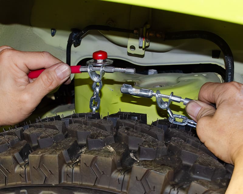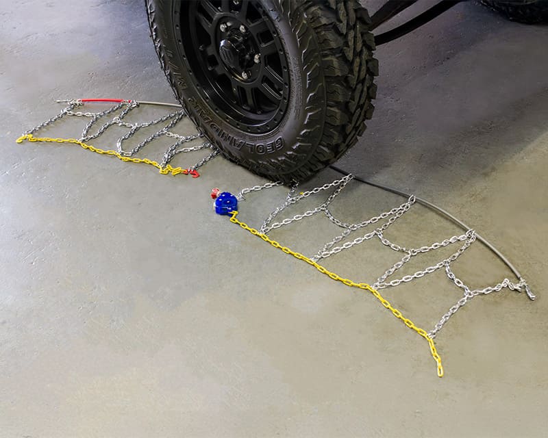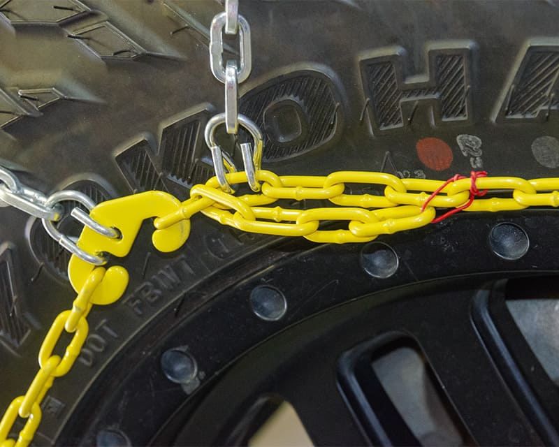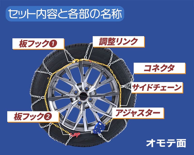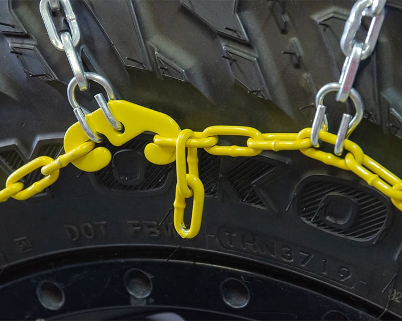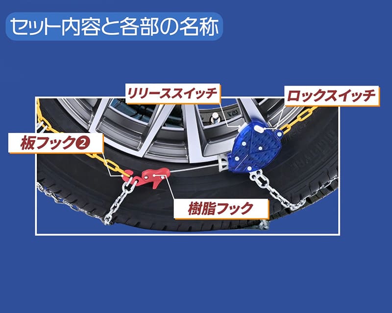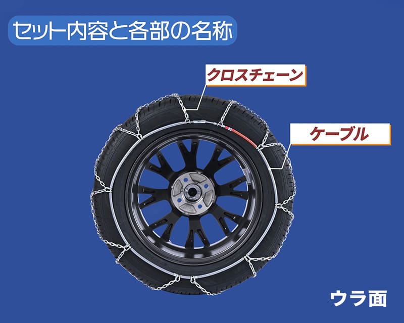 チェーンの材質には摩耗に強い高強度の特殊合金鋼を採用しているので、製品寿命がUP。また、角断面チェーンが雪・氷をがっちりキャッチするので、雪の上では「滑らずに進む」、氷の上では「停止距離を短くする」効果を発揮、特に「アイスバーン」「圧雪路」「登坂」など、厳しい条件で威力を発揮します。