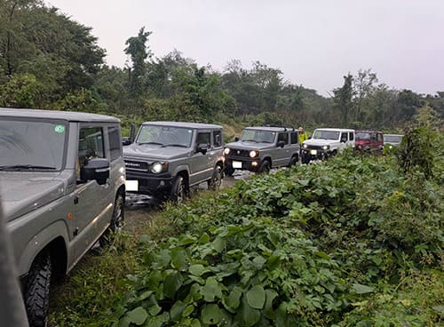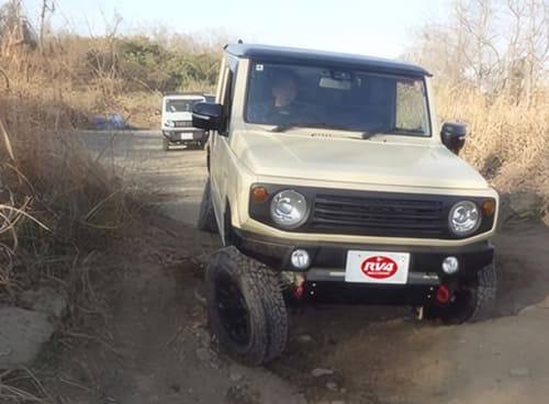 ※参加車両は20mm以上のリフトアップ、前後に頑丈な牽引フック、トランスファーガード、サイドシルガード、燃料タンクガード、185/85R16以上のタイヤの装着、SJ30〜JA22は走行中の接触等で曲がる可能性があるためナンバーの移動を、幌車はロールケージとヘルメットを装着してください。